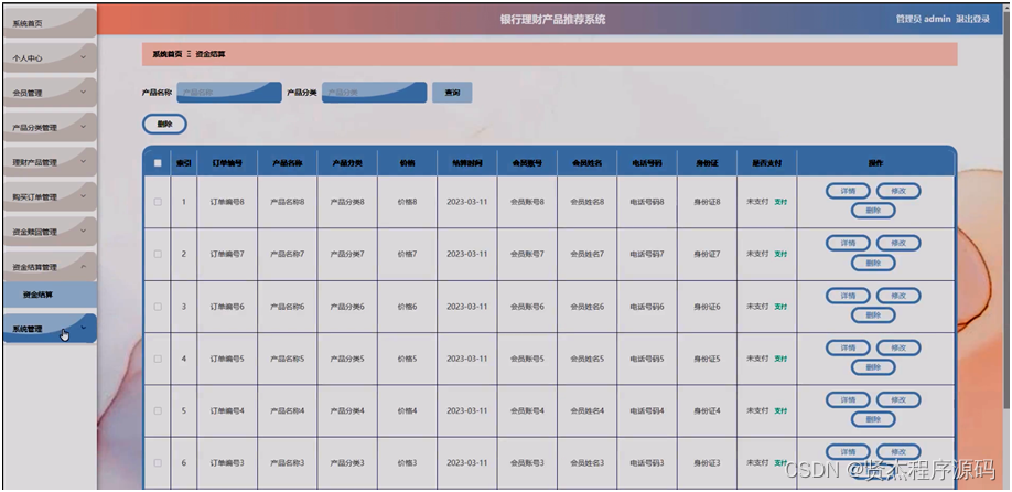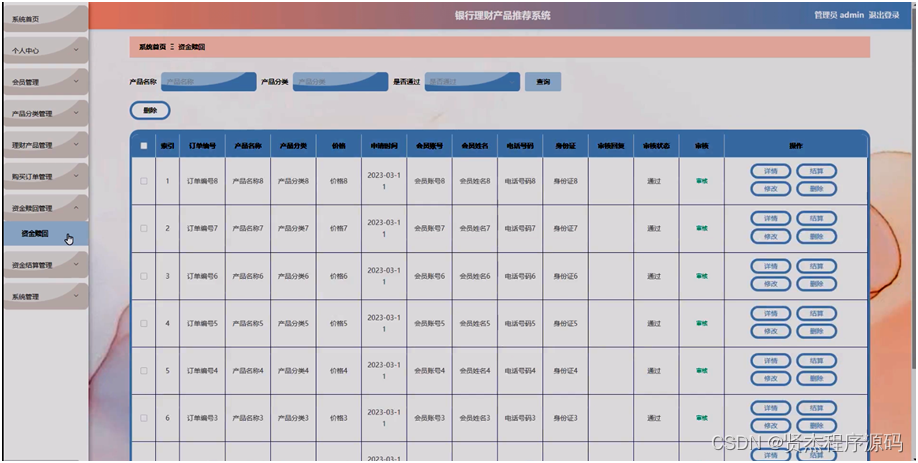 管理员点击资金结算管理,进入资金结算管理页面输入产品名称、产品分类、是否通过可以查询,并进行查看详情、修改、和删除等操作。如图5-14所示: