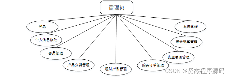 (2)、管理员的功能是最高的,可以对系统所在功能进行查看,修改和删除,包括用户功能。管理员用例如下: