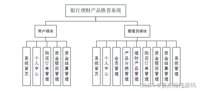 网上银行理财产品推荐系统按照权限的类型进行划分,分为用户和管理员两个模块。用户模块主要实现个人信息修改、对理财产品、银行公告、后台管理、个人中心等信息进行操作,增强了用户的操作体验。管理员模块主要针对整个系统的管理进行设计,提高了管理的效率和标准。系统的总体模块设计如下图所示: