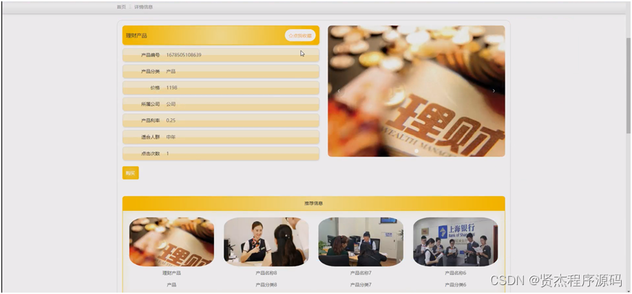 在理财产品页面的输入栏中输入产品名称、产品分类、所属公司进行查询,进入理财产品页面可以查询到产品详细信息,并进行查看和收藏操作,页面如图5-3所示: