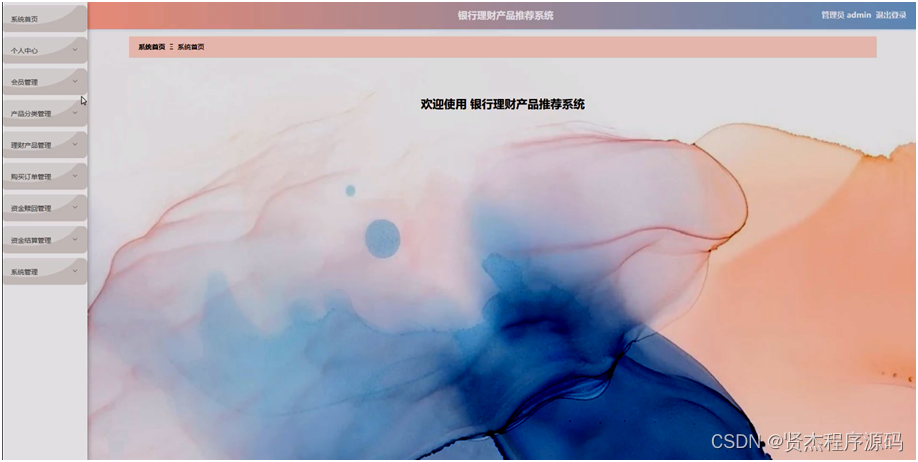 管理员进入主页面,主要包括对个人中心、会员管理、产品分类管理、理财产品管理、购买订单管理、资金赎回管理、资金结算管理、系统管理等进行操作。管理员主页面如图5-8所示: