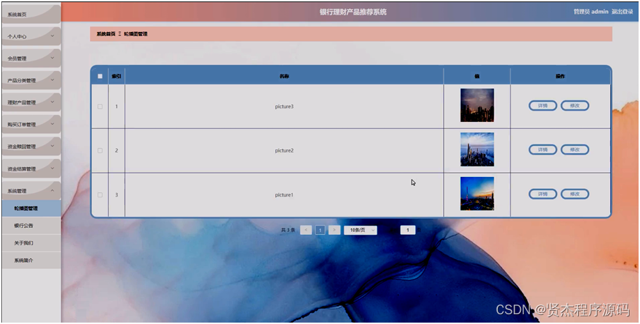 管理员点系统管理,进入系统管理页面,点击轮播图管理,在轮播图管理页面并进行查看详情,修改等操作;还可以对用户公告、关于我们、系统简介进行详细操作;轮播图管理界面如图5-15所示: