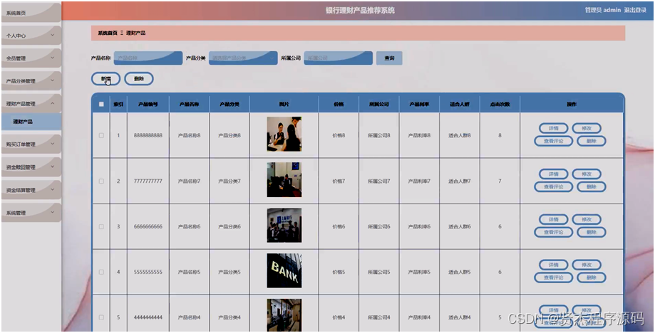 管理员点击理财产品管理。进入理财产品管理页面输入产品名称、产品分类、所属公司可以查询,新增或删除产品详细信息,并进行查看详情,修改、查看评论和删除等操作。如图5-11所示: