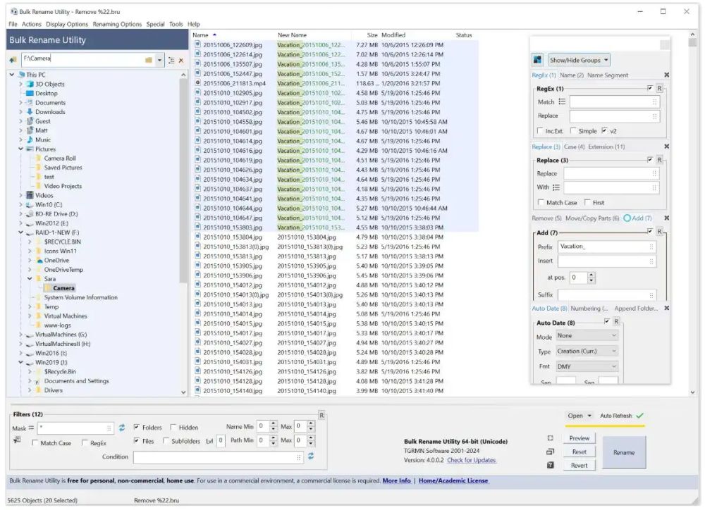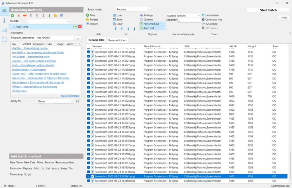 提供强大的基于方法(Method)的重命名方式,允许用户添加多种重命名条件(如从元数据读取信息、文本操作、序号、日期时间等),并将它们灵活组合,生成最终的新文件名。