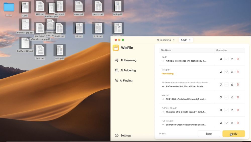 如果需要同时整理文件夹,可利用 AI 识别的信息设置规则,让 Wisfile 自动将文件移动到指定分类文件夹并应用命名规则。