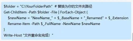 2.编写与执行: 在PowerShell窗口中直接输入并运行重命名脚本命令,或者将脚本保存为.ps1文件后执行(执行前可能需要修改系统执行策略)。