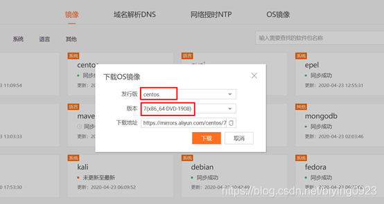 (2)在弹出的下载框中,发行版选择centos,版本选择7(x86_64-DVD-1908),下载地址会自动填入,点击下载按钮即可