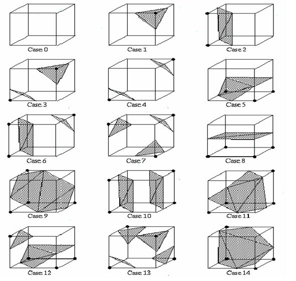 下图所示为MC算法的15种基本情况,其中黑点表示标记为1的角点,标记为0的角点在图中立方体上为未作记号的顶点。