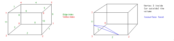 }另外VTK通过构造“三角剖分”查找表中确定三角剖分形式,图3·13举例了查找表其中一种构型的构造过程,左为立方体顶点和其边的编号,右为基本构型中的其中一种。