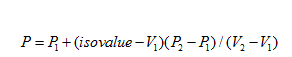 当体素内三角面片剖分模式确定后,三角面片顶点位置是通过线性插值方法计算得到的,这是因为MC算法假设立方体边数据场呈线性变化。对于体素某一棱边,设其两个端点(p1、p2)的标量数据为v1、v2,那么插值得到的交点(即三角面片的顶点)为p: