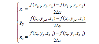 在计算出三角面片各顶点处坐标后,虽然可以通过叉积的方法计算该顶点处的法向量,但这种做法计算量较大。MC注意到,对于等值面上任意一点而言,该点处等值面的切线方向在等值面上无变化率可言,而梯度方向是方向导数变化率最大的方向,因此,该点的梯度方向就是该点在等值面上法向量的方向。前文已经讲述MC算法假设立方体边数据场呈线性变化,为了方便求出三角面片顶点处的法向量,可以先分别求出该三角面片顶点所在体素棱边上的两个角点的梯度,然后再次通过线性插值,计算该三角面片顶点的法向量。所谓的中心差分,就是计算当前角点在某个方向上前向和后向两个角点的标量的差分,体素角点的中心差分公式如下: