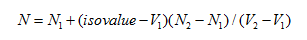设立方体顶点处的法向量为N1、N2(标量数据仍为V1、V2),再次利用线性插值得到的三角面片顶点处法向量为:
