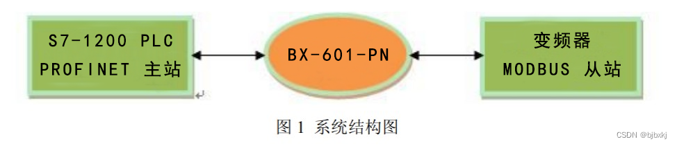 1、系统架构:现场的 S7-1200PLC 是作为 ProfiNet 的主站,变频器作为 Modbus 从站。因此该项目中 Modbus转Profinet网关设备在 ProfiNet侧作为从站,在Modbus侧作为主站使用。
