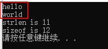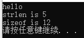 printf("sizeof is %d\n", sizeof(str5)); // sizeof 遇到'\0'不停止,计算结果  包含'\0',所以长度为12(hello + 中间的'\0' + world + 字符串结尾默认的'\0')
