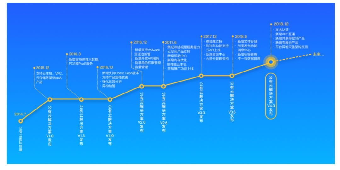 公有云产品及解决方案还在持续的优化和完善中,计划在2019年引入边缘节点服务、消息队列服务、Redis服务、大数据服务,同步对基础的IaaS服务进行功能和性能调优,新增引入资源加密、容灾备份等解决方案,敬请期待!