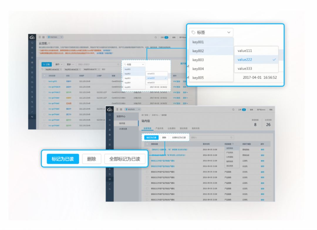 4) 标签管理:支持对计算、存储、网络等产品进行tag标识,可支持根据tag对资源进行快速过滤。