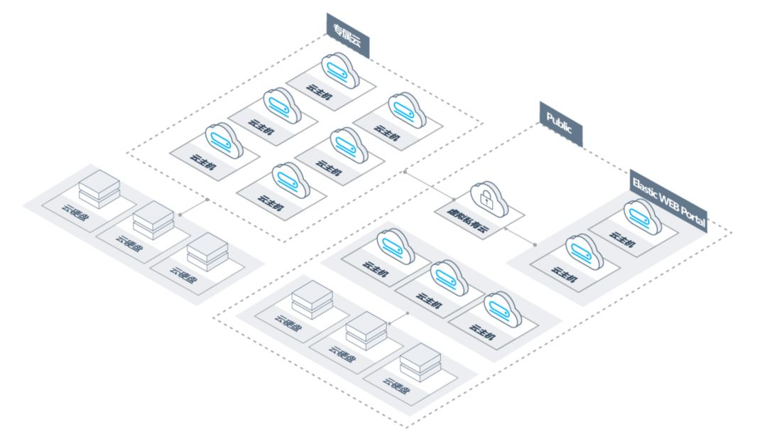 8)专属云:支持客户在公有云上创建自己的专属云集群,并可在专属云集群中创建自己专属的云主机,该云主机与其他租户的云主机不共用物理资源,可做到从物理层面的隔离,满足客户的高级安全要求,专属云也可为客户开放一些集群管理功能,赋予客户更灵活的集群管理权限。
