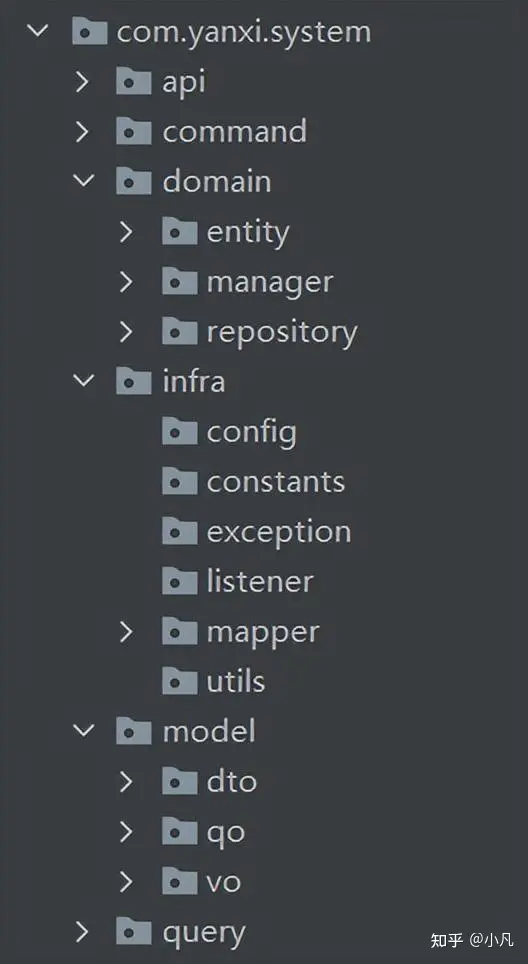 - 应用层:这里使用了命令模式,并且读写分离成了两个包(command、query),如果不使用命令模式可以合并成一个service包