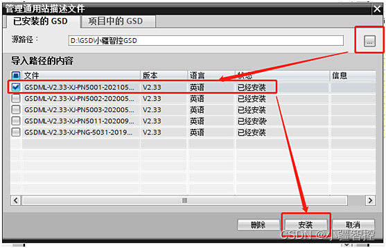 3、搜索GSD文件存放文件夹,搜索到GSD后选择安装,等待安装成功;