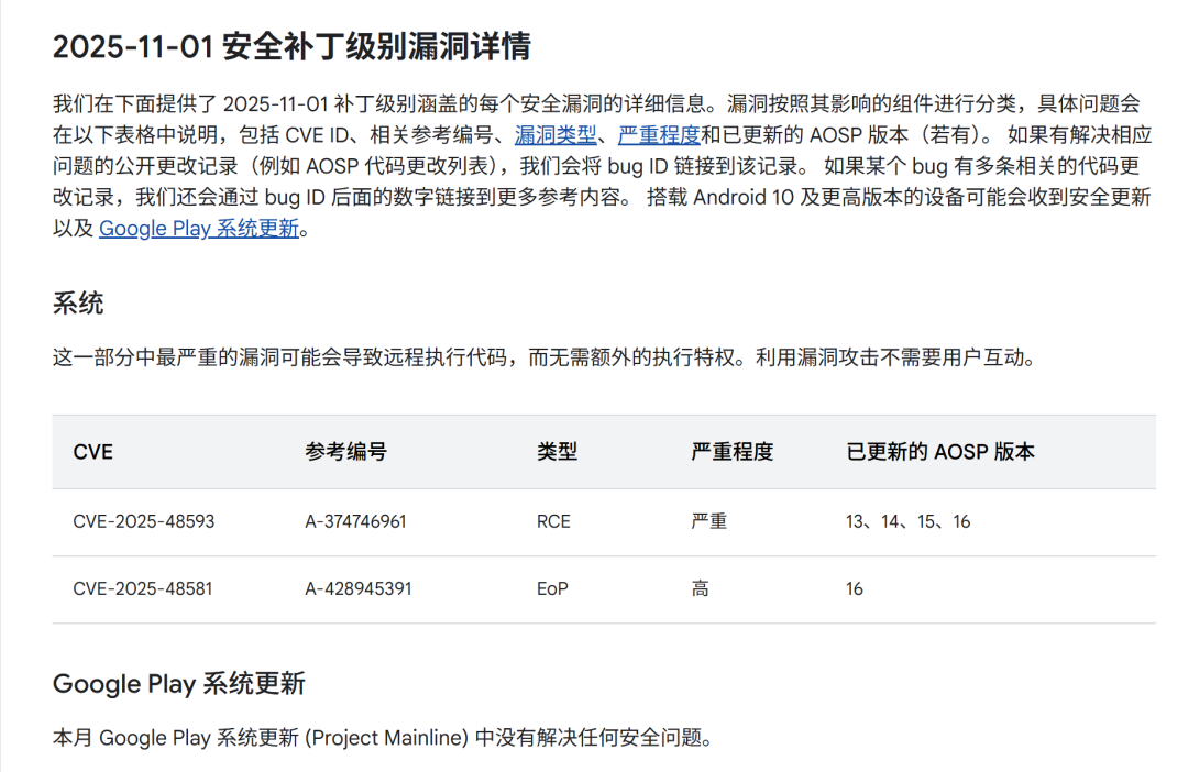 谷歌的 2025 年 11 月 Android 安全公告(简称为 ASB)仅修复了两个系统组件漏洞,这延续了其“精简版”风格,聚焦于高优先级问题。
