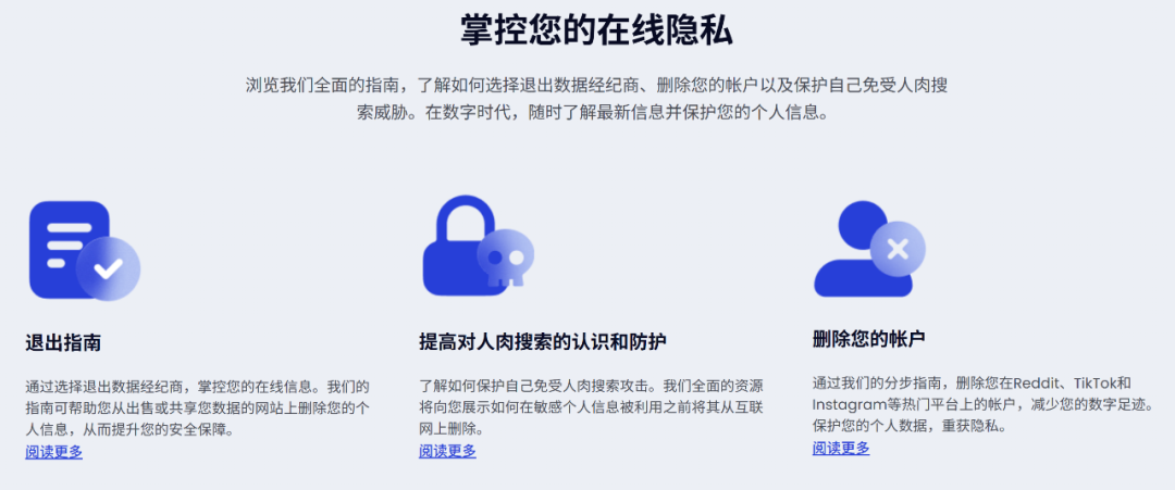 关键功能包括免费风险评估、数据泄露报告、“请勿跟踪”浏览器扩展、管理与数千公司的信任关系,以及处理垃圾邮件退出。