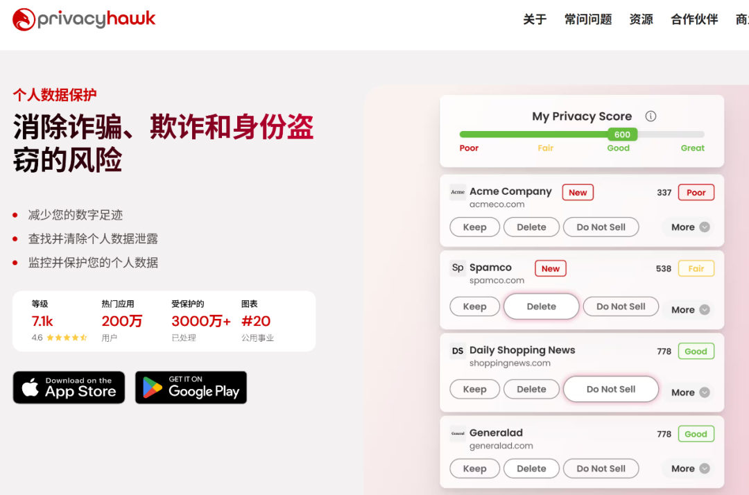 (网站:https://www.privacyhawk.com)以实惠和移动优先闻名,提供免费层级服务。它自动化从公司数据库中移除数据,处理电子邮件退订,并帮助删除旧在线账户,顶级层级添加身份盗窃保护。其工作原理是从约100个精选经纪人网站移除数据,通过智能手机自动化操作。它独特之处在于覆盖经纪人较少,但专注于移动端管理,适合预算有限的用户。