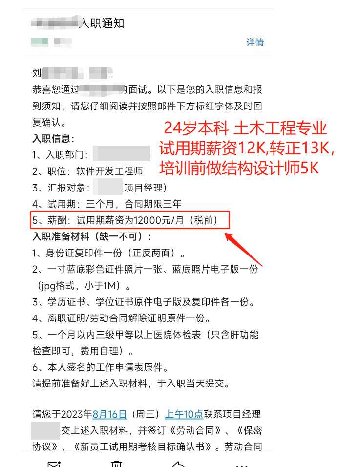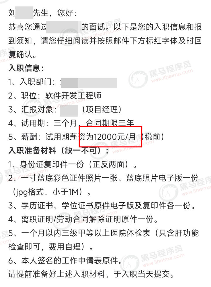 总结原因时发现自己技术和项目经验都达不到企业的更高要求。再三考虑之后,他选择来黑马继续学习Java。因为他看好Java的就业前景,知道入这行只要提升技术,找一份高薪工作不是难事。经过为期半年的提升,从黑马毕业之时,他拿到了多个offer,最终选择了 12k 的工作,他说,这是现在的起点,未来会继续加油!