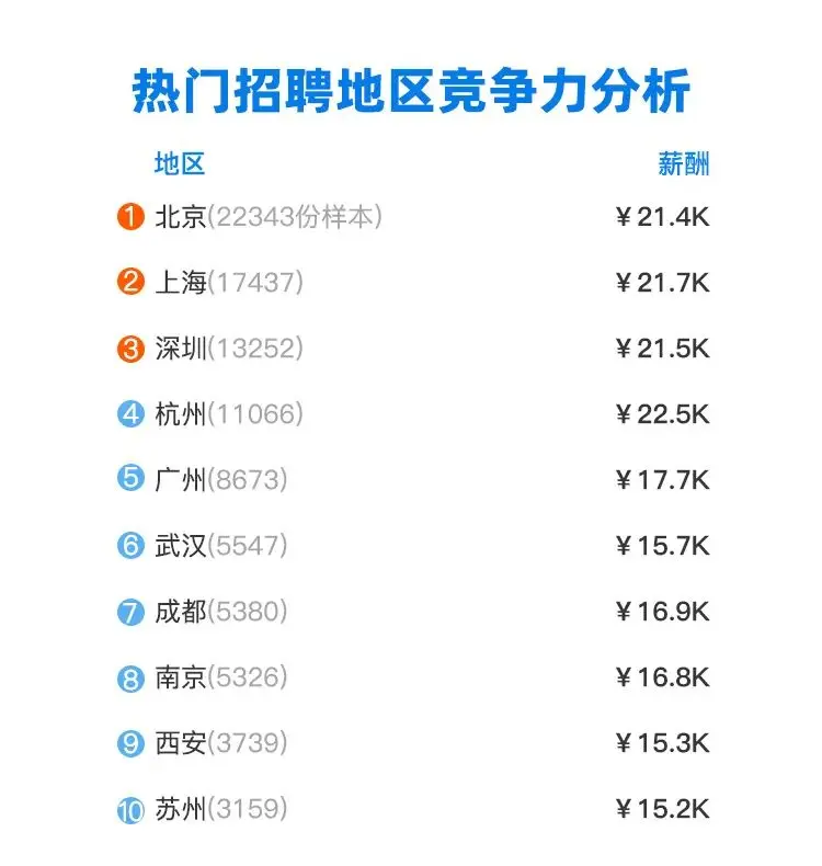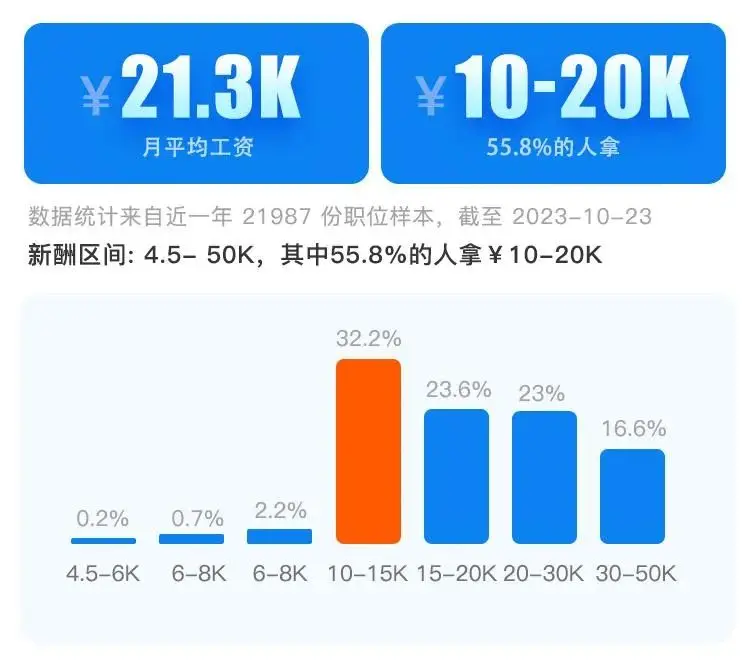 据第三平台职友集最新统计,Java开发工程师在全国的平均薪资是17.5k,远高于2023年应届生平均招聘月薪 10342 元,另外,在互联网行业发达的一线城市,Java开发工程师的薪资更是可以突破20k,比如北京的均薪便高达 21.3k 。