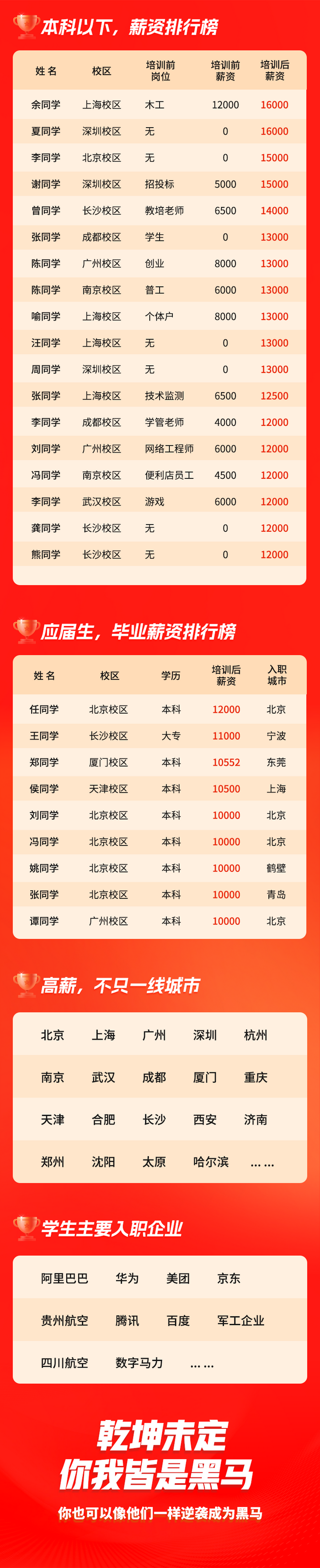 北京顺义校区188期巩同学、成都校区59期康同学、西安校区102期赵同学等纷纷拿到华为offer;西安校区102期高同学拿到阿里巴巴高薪offer……