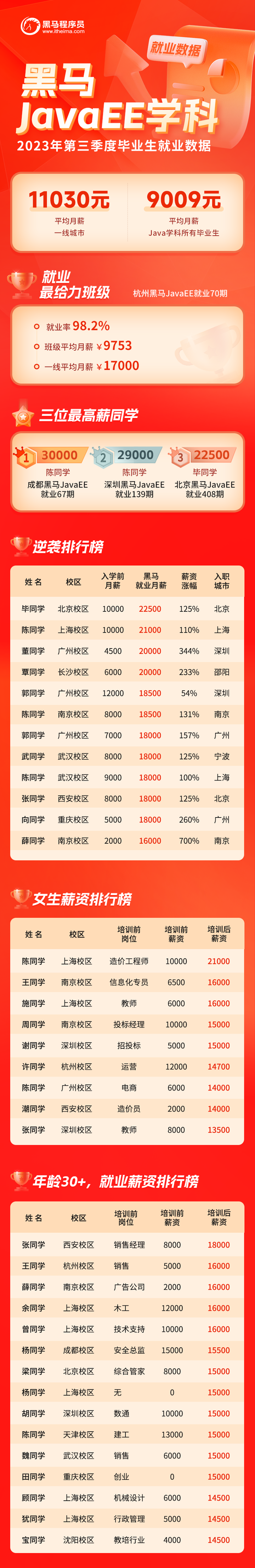 在整个三季度,黑马JavaEE学科的学生就业强劲,不仅就业率高,薪资也非常可观,最高薪资达到 3w!在今年大学毕业生普遍找工作难的情况下,他们逆势而上,拿到自己的心仪offer,找到了自己的职场定位,超额完成了当初来黑马定下的目标!