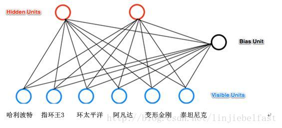 下面我们通过一个简单的电影例子来理解RBMs如何进行建模和学习。例如我们有6部电影:(哈利波特、阿凡达、指环王3、泰坦尼克、变形金刚、环太平洋)。并且我们事先要求用户告诉我们那部电影或那几部电影是他选择想观看的(用户的观看选择数据作为网络的输入,如果想看则输入为1,不想看为0。例如一个用户如果想看哈利波特、阿凡达,则输入为110000)。如果假设我们想通过一RBMs将6部电影进行建模,抽象为两个潜在的类别,即2个隐藏节点。我们可以设置有两个隐藏节点的RBMs,这两个隐藏节点是这些电影的一种抽象特征,例如可以是这些电影的分类类别信息。这两个类别可以是,例如:1)优秀的影片(例如哈利波特,变形金刚,指环王3),2)奥斯卡获奖影片(例如指环王3,泰坦尼克,阿凡达),也可以是其它类别,如适合年轻人的和适合老年人的。构建的RBMs网络有如下图所示的拓扑结构。