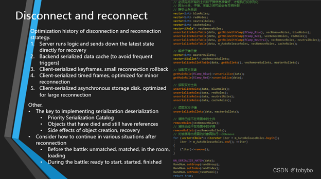 对于断线和重新连接,因为我们有序列化和反序列化的设计,所以不需要像典型的帧同步游戏那样从头到尾运行来获取当前状态。如果是通常的帧同步机制,在游戏已经运行了很长时间后,获取一个长时间的重新连接实例会非常痛苦。