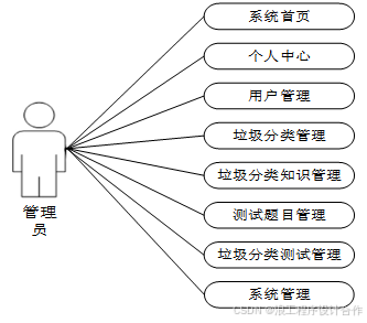 (2)、管理员主要包括系统首页,个人中心,用户管理,垃圾分类管理,垃圾分类知识管理,测试题目管理,垃圾分类测试管理,系统管理等有关功能进行管理。管理员用例如下: