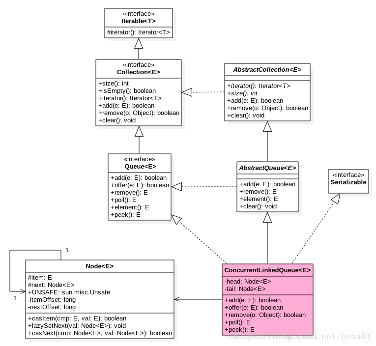 下面从源代码中分析ConcurrentLinkedQueue的实现方法。
