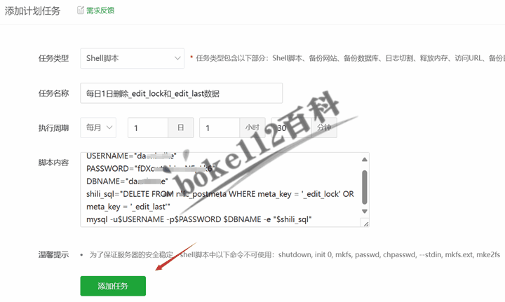宝塔面板在计划任务中怎么执行SQL语句删除_edit_lock和_edit_last? 我们可以用宝塔面板计划任务的shell脚本和MySQL -e参数来执行各种SQL语句,包括创建、删除、增加、修改、查询等,从而达到操作mysql数据库目的。