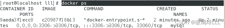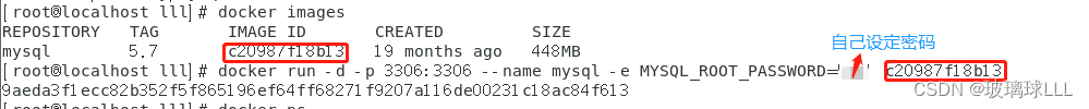 根据镜像id构建mysql容器,且分配端口号[root@localhost lll]# docker run -d -p 3306:3306 --name mysql -e MYSQL_ROOT_PASSWORD='密码自己设定' c20987f18b13