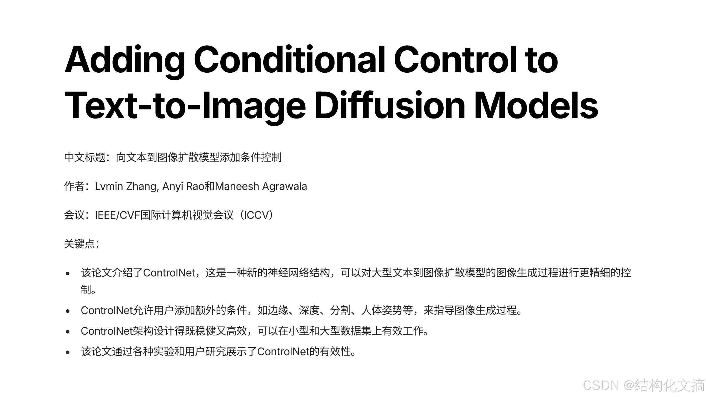 大家好!今天我要给大家介绍一篇发表在计算机视觉领域顶级会议 ICCV 上的论文。这篇论文的题目是《为文本到图像的扩散模型添加条件控制》。 论文提出了一个名为 ControlNet 的神经网络结构,它可以用来更精确地控制大型文本到图像扩散模型的图像生成过程。ControlNet 允许用户添加额外的条件,例如边缘、深度、分割、人体姿势等,来指导图像生成过程。 ControlNet 的架构设计得非常鲁棒和高效,无论数据集大小都可以有效地工作。此外,论文通过各种实验和用户研究证明了 ControlNet 的有效性。