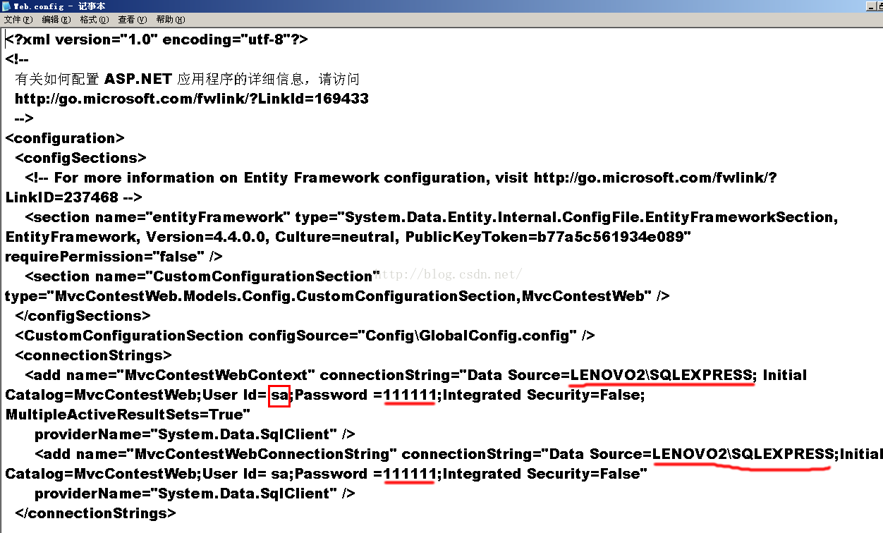 红色字体,需要修改为贵方的[服务器名称]、[用户名称]、[Sql登陆密码]实际参数.