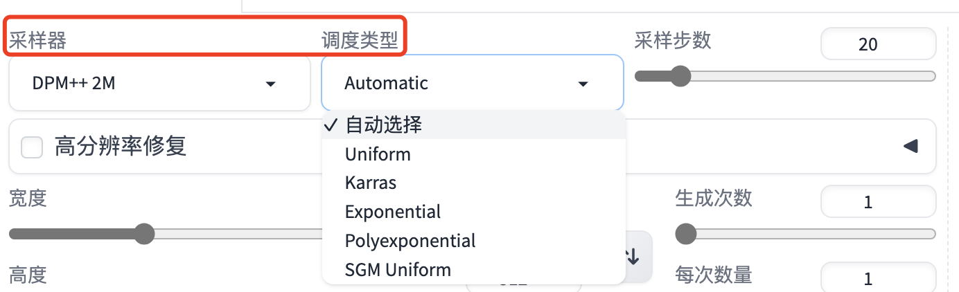 之前它是和采样方法放到一起的,采样方法是去除噪音的算法,比如 DPM++ 2M Karras,其中的Karras就是调度器,DPM++ 2M才是真正的采样方法。现在为了更容易控制和理解,它们分家了。