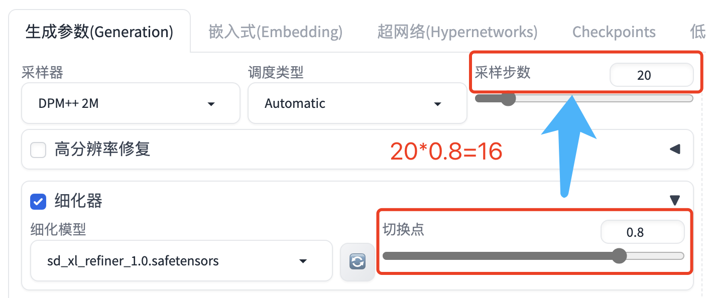 在 Stable Diffusion WebUI 之前的版本中,从基础模型到精修模型的切换时机依赖的是采样步数,如下图所示:在迭代步数为20,切换点为0.8的设置下,前16步采样将使用基础模型,后4步采样将采用精修模型。