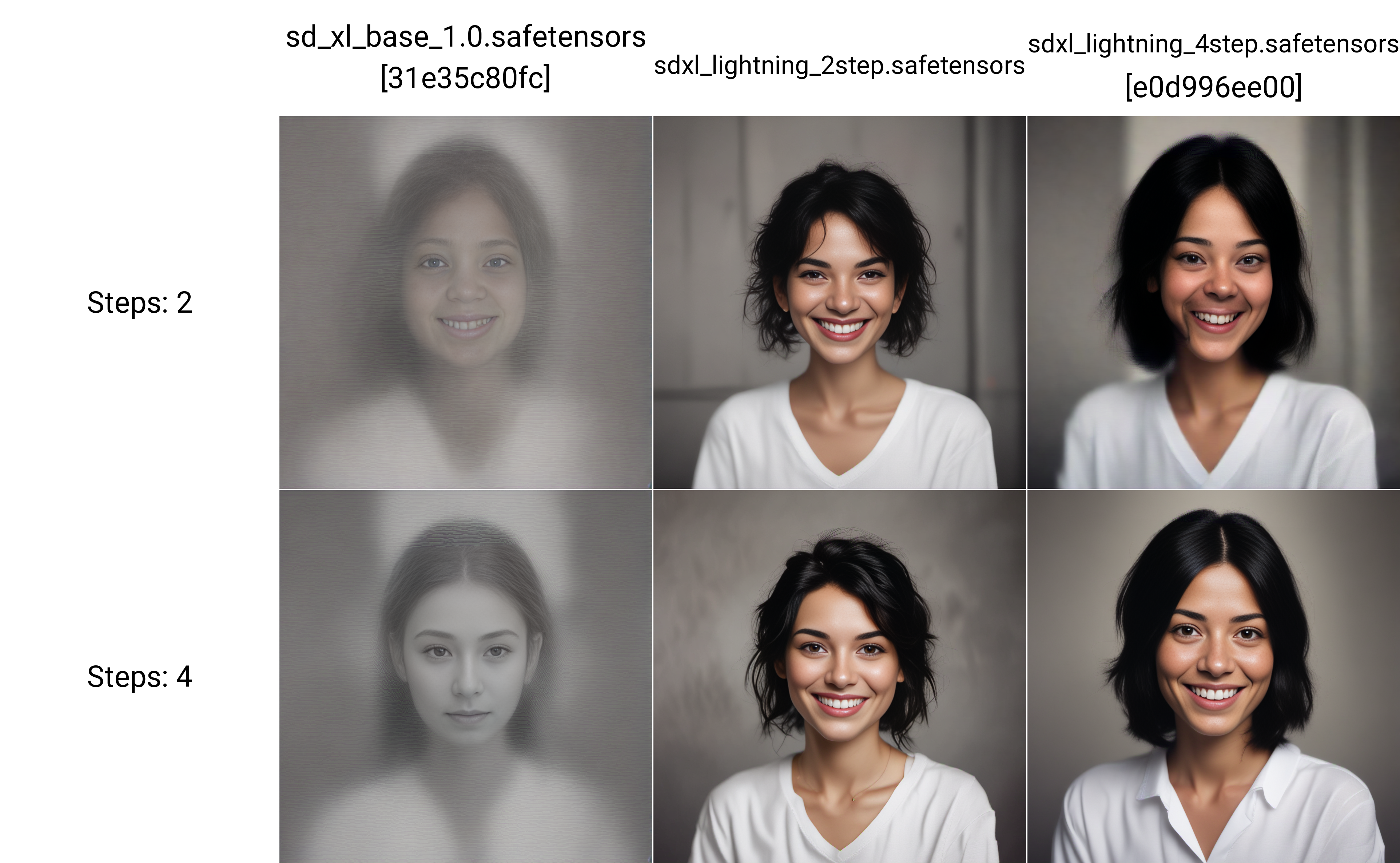 对于原版的SDXL,2-4步只能出个大概的面部轮廓,对于闪电模型,4步较为完美。