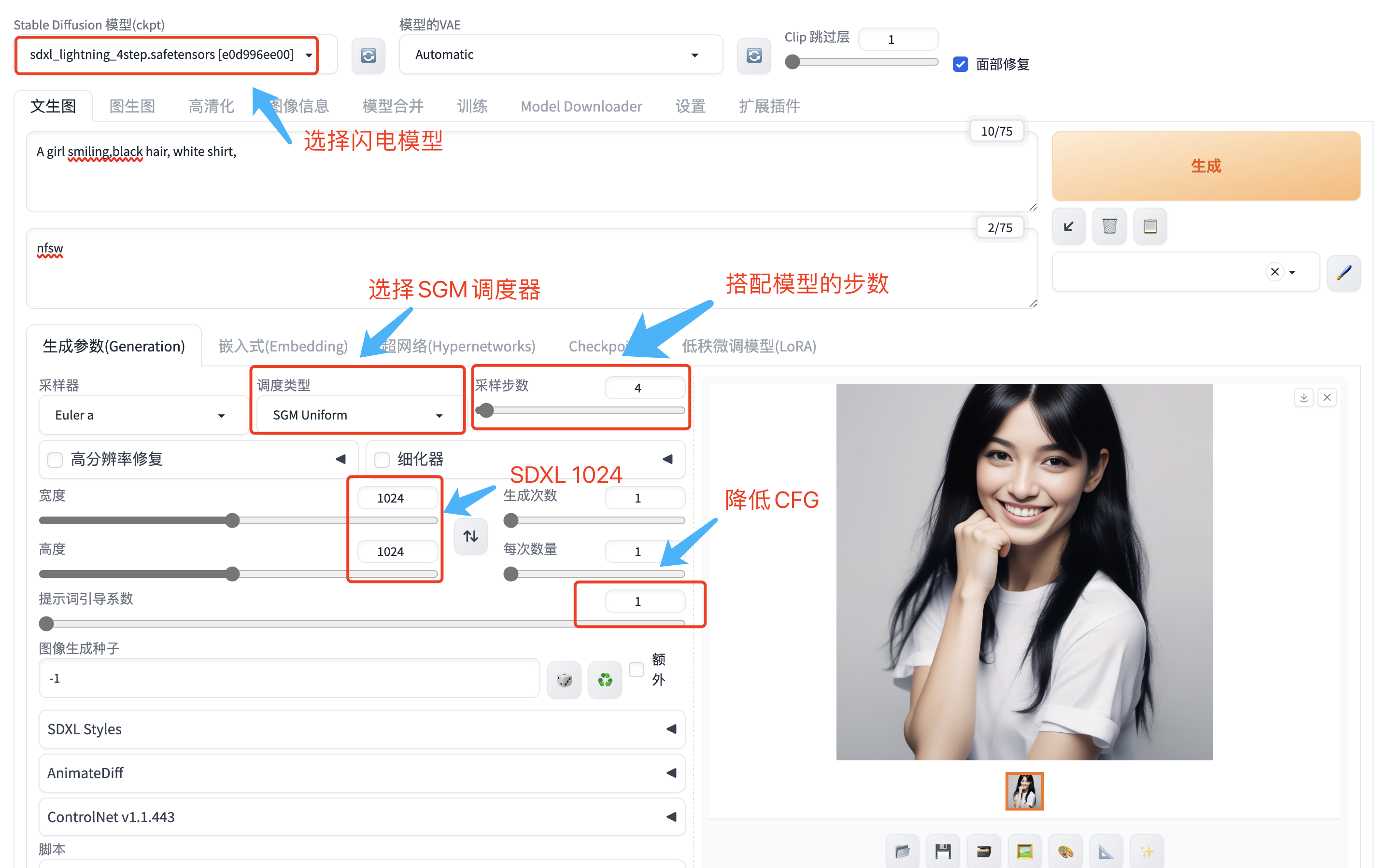 Stable Diffusion WebUI之前的调度器都不能很好的适应这个模型,导致出图质量不佳,现在一个新的调度器来了,sgm-uniform可以让SDXL-Lightning在SD WebUI中表现的更加完美。