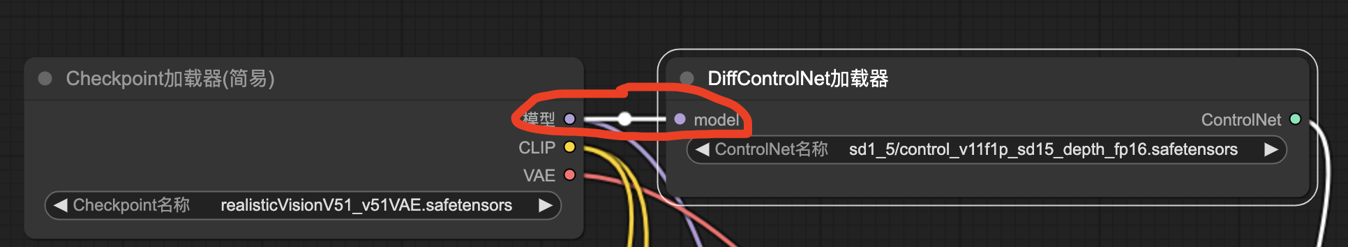 - SD基础模型:上面已经提过,ControlNet模型不能独立工作,所以上图中的“ControlNet加载器”需要以模型作为输入,图中的“模型”接入点要连接到名为“Checkpoint加载器”的节点,以获取SD基础模型。