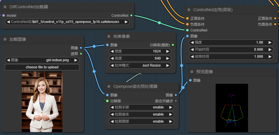 - 预览图像:预览ControlNet预处理器生成的参考图片,这个节点不是必需的,只是想看看预处理器提取的特征效果如何。这个图像将被送到“ControlNet应用”中进行编码处理。如果我们已经有了这个参考图片,前边的预处理器、完美像素都是可以不要的。