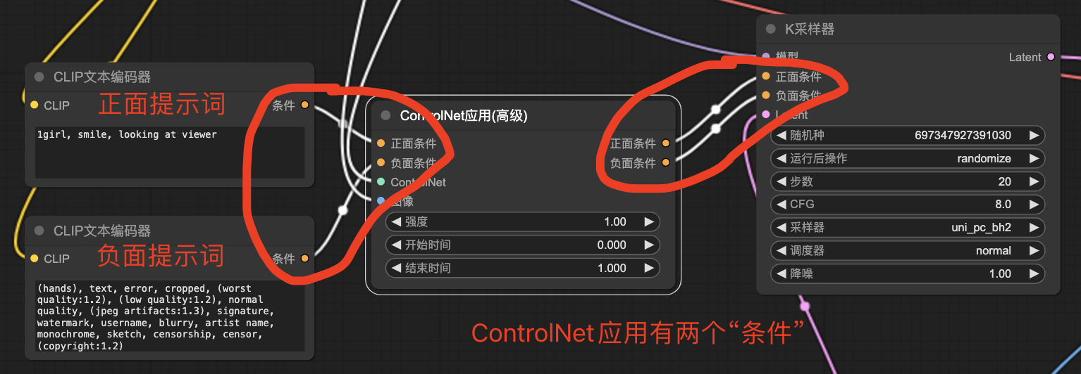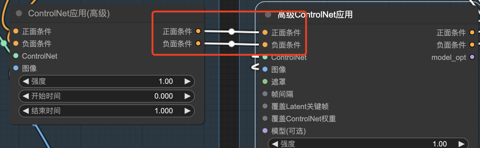 下图是“ControlNet应用(高级)”有两个条件参数的连接线示例: