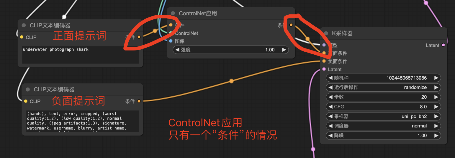 下图是“ControlNet应用”只有一个条件的连接线示例: