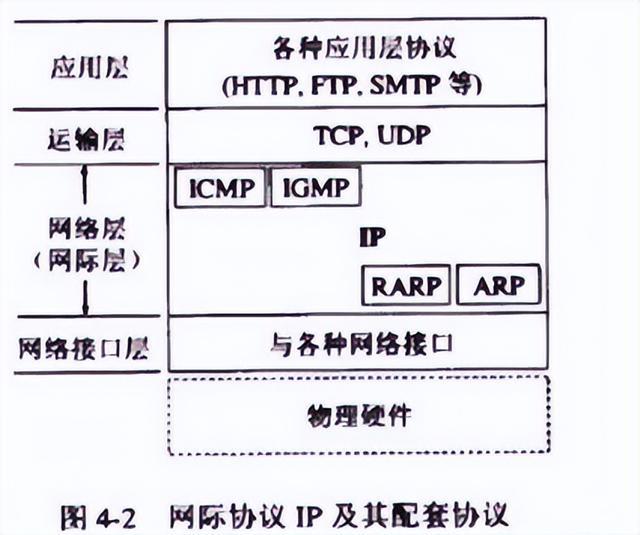 网际协议IP是TCP/IP体系中两个最主要的协议之一,也是最重要的因特网标准协议之一。与IP协议配套使用的还有四个协议:地址解析协议ARP,根据IP地址获取其物理地址;逆地址解析协议RARP,根据物理地址获取其IP地址;网际控制报文协议ICMP;网际组管理协议IGMP。IP协议与其配套协议关系如下