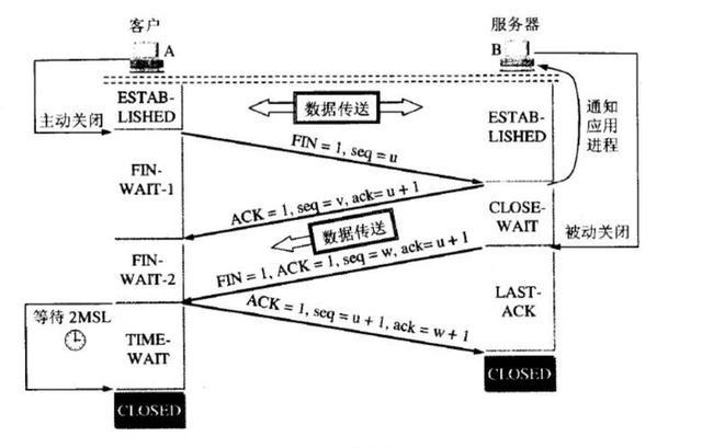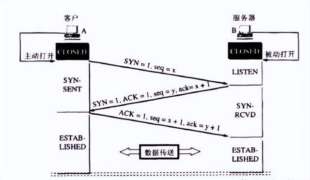 TCP的连接建立,三次握手。如图所示,假定主机A运行的是TCP客户程序,而B运行TCP服务器程序,最初两端的TCP进程都处于CLOSED(关闭)状态,A主动打开连接,B被动打开连接。