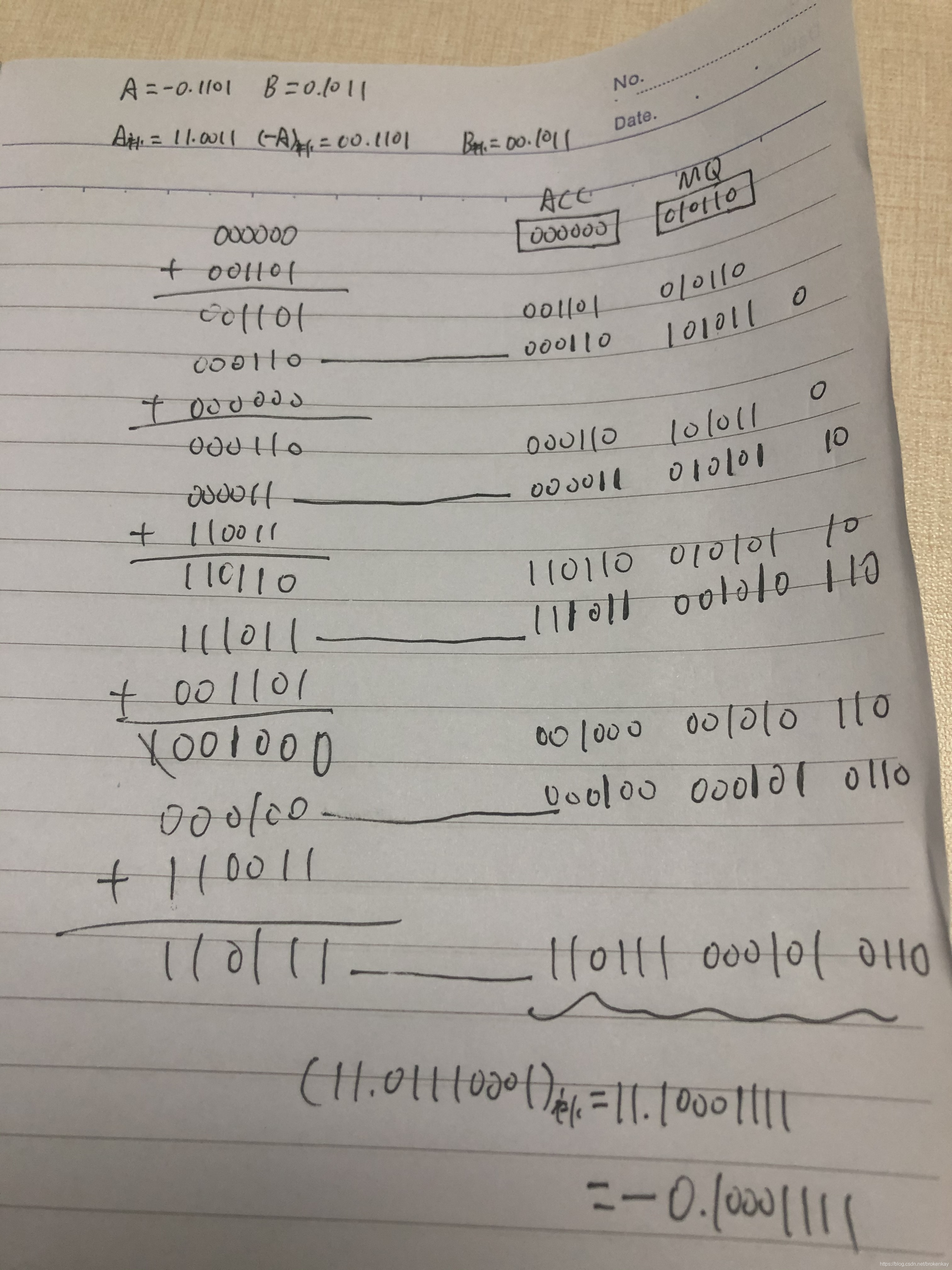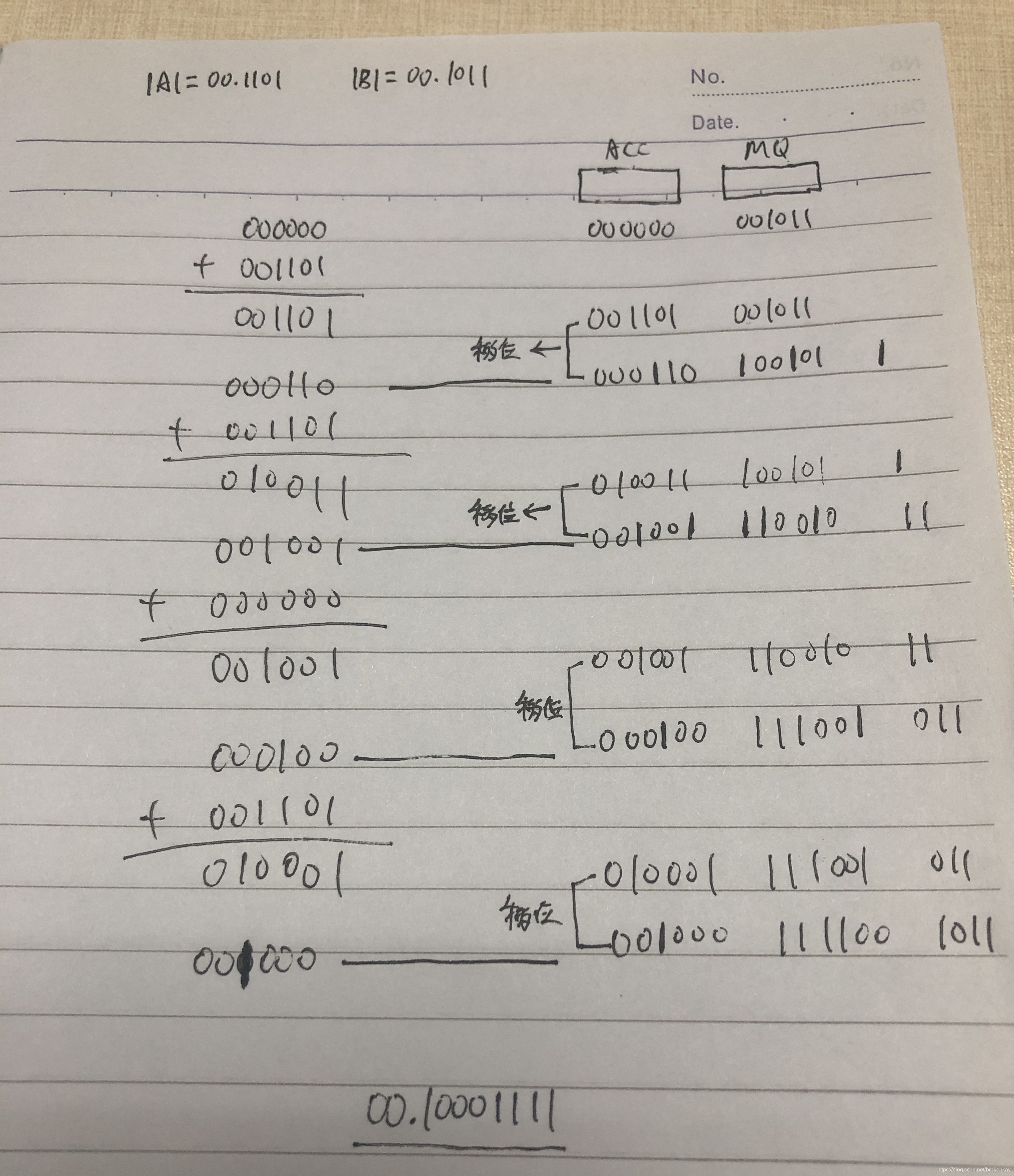 详细计算过程如下图.ACC初始时装着000000,MQ初始时存着单符号位B的值并在最后面添加个辅助位0,即010110.