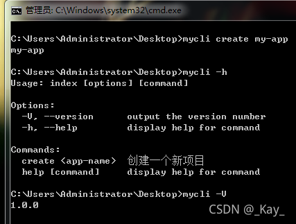调用方法如下图所示.mycli create my-app成功调用了定义的命令,最后打印输出appName为my-app.